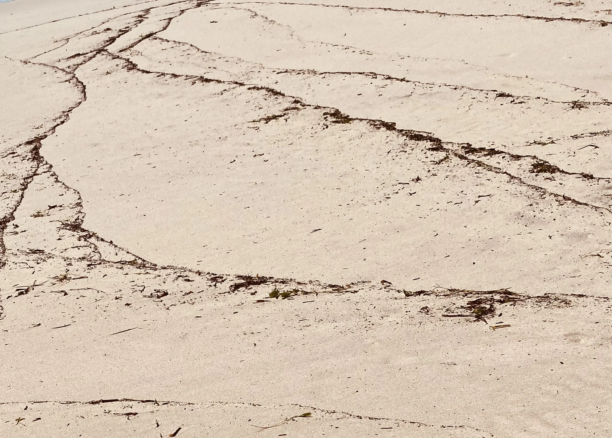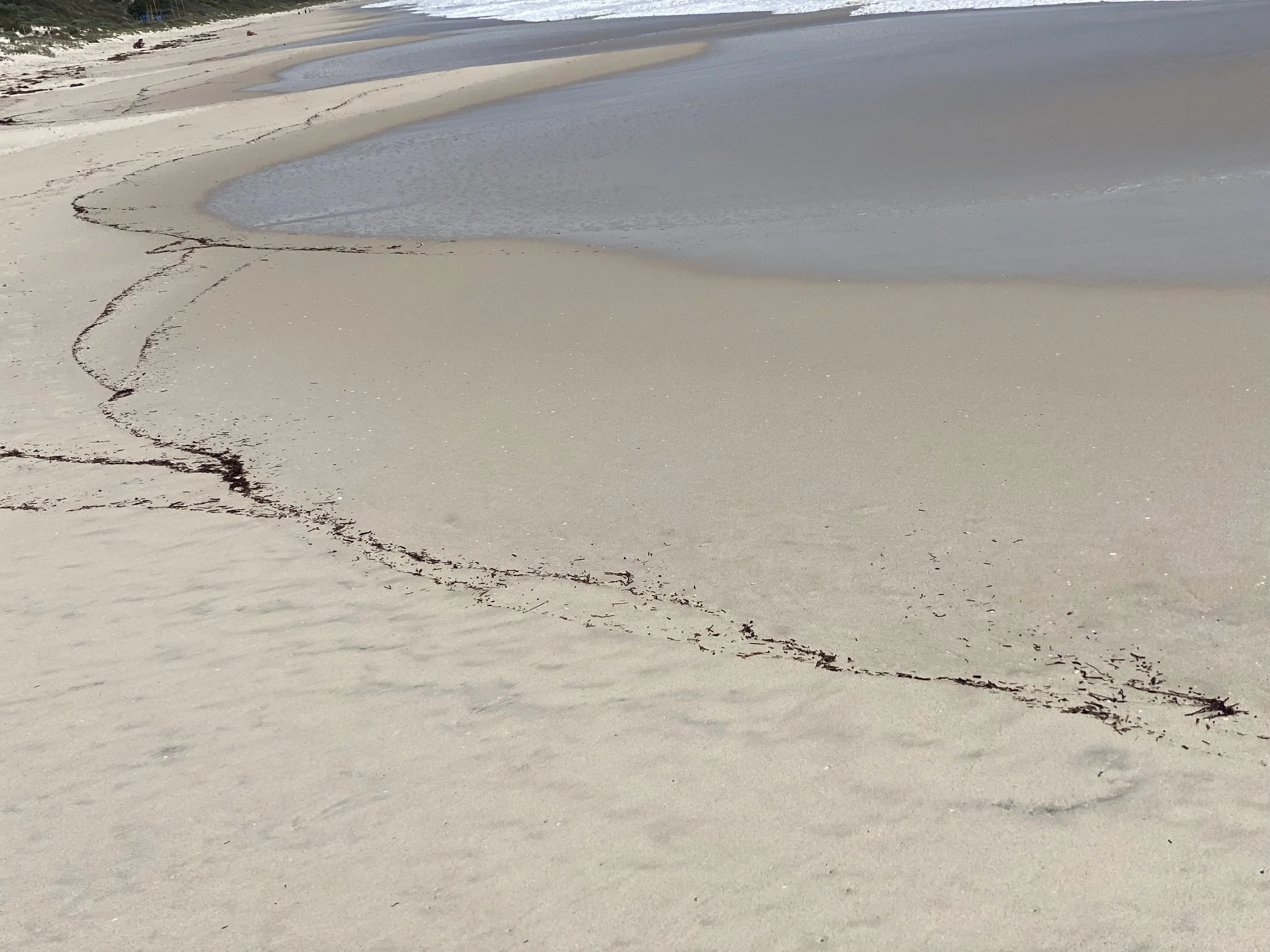 The seaweed known as “beach wrack’ washes up from the sea into the surf zone and onto the beach. While the majority of Beach wrack is made up of seagrass and seaweed, seaweed often dominates and the sheer abundance of wrack that occurs along the W.A. coastline has resulted in Western Australia becoming a world lead-in beach wrack research. What my artist’s eye observed was the whispy irregular patterning that appeared magically and in my eyes were expressive line drawings of many variations that scattered across the beach left remaining after the high tide had withdrawn.